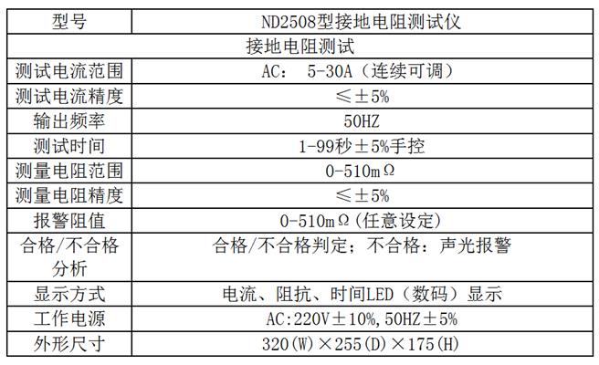 ND2508型交流接地電阻測(cè)試儀適合用于測(cè)量各種電機(jī)、電器、儀器儀表、家用電器等設(shè)備的外殼與其接地線之間的電阻值。