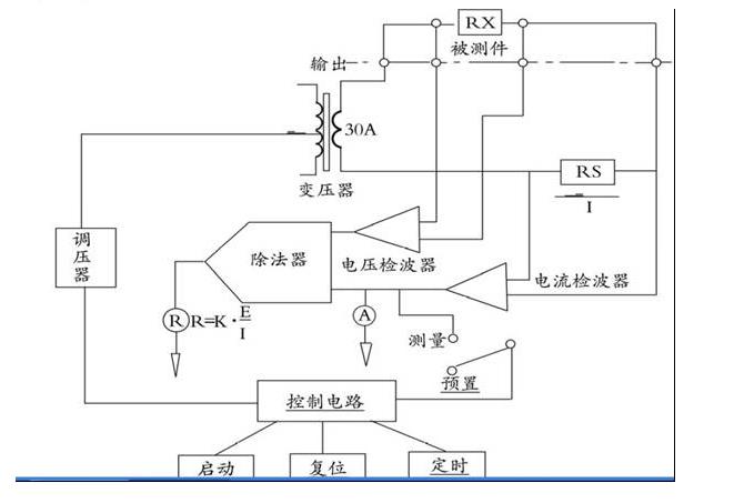 (3)接上負(fù)載,按一下“啟動(dòng)”按鈕,調(diào)節(jié)“電流輸出”,來(lái)調(diào)節(jié)測(cè)試電流至規(guī)定值,即可進(jìn)行測(cè)試,此時(shí)“mΩ”表將顯示被測(cè)件的電阻值。如果被測(cè)件電阻等于或大于電阻預(yù)置值,則儀器將超阻報(bào)警,蜂鳴器發(fā)出響聲,超限黃燈點(diǎn)亮,輸出電流被切斷,表示被測(cè)件不合格,按一下復(fù)位按鈕,解除報(bào)警,方可進(jìn)行下次測(cè)試。如果測(cè)試電流超過(guò)30A,也會(huì)產(chǎn)生過(guò)流聲音警示現(xiàn)象。由于負(fù)載不完全一樣,測(cè)試時(shí)需調(diào)節(jié)“電流調(diào)節(jié)”至所需測(cè)試電流。