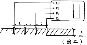 測量時(shí)在被測的土壤中沿直線插入四根探針,并使各探針間距相等,各間距的距離為L,要求探針入地深度為L/20cm,用導(dǎo)線分別從C1、P1、P2、C2各端子與四根探針相連接。若地阻儀測出電阻值為R,則土壤電阻率按下式計(jì)算: