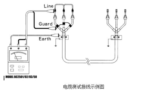 (EARTH)(3)端,另一頭接于被試設(shè)備的外殼或地上。以電纜測試為例接法