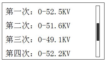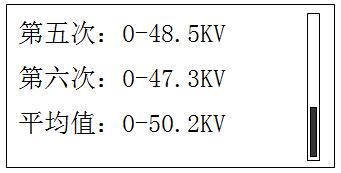 4.1.2、油樣擊穿或到電壓升到最高設(shè)定值,儀器立即切斷主回路電源,LCD關(guān)閉顯示。大約3秒鐘后,LCD顯示降壓界面;