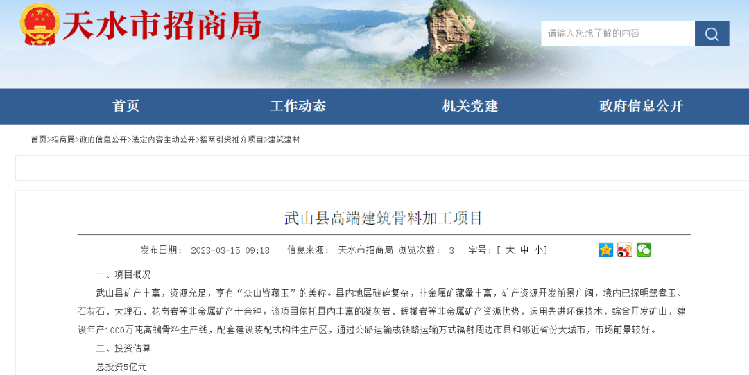 據(jù)中國(guó)砂石協(xié)會(huì)獲悉,近日,甘肅省天水市招商局公布了清水縣花崗巖建筑骨料生產(chǎn)項(xiàng)目和武山縣高端建筑骨料加工項(xiàng)目進(jìn)展情況,兩個(gè)項(xiàng)目合計(jì)投資23億元,每年共計(jì)生產(chǎn)加工4000萬(wàn)噸建筑骨料。資源儲(chǔ)量共計(jì)約為11.2億噸!目前兩個(gè)項(xiàng)目都已完成項(xiàng)目建議書(shū)。